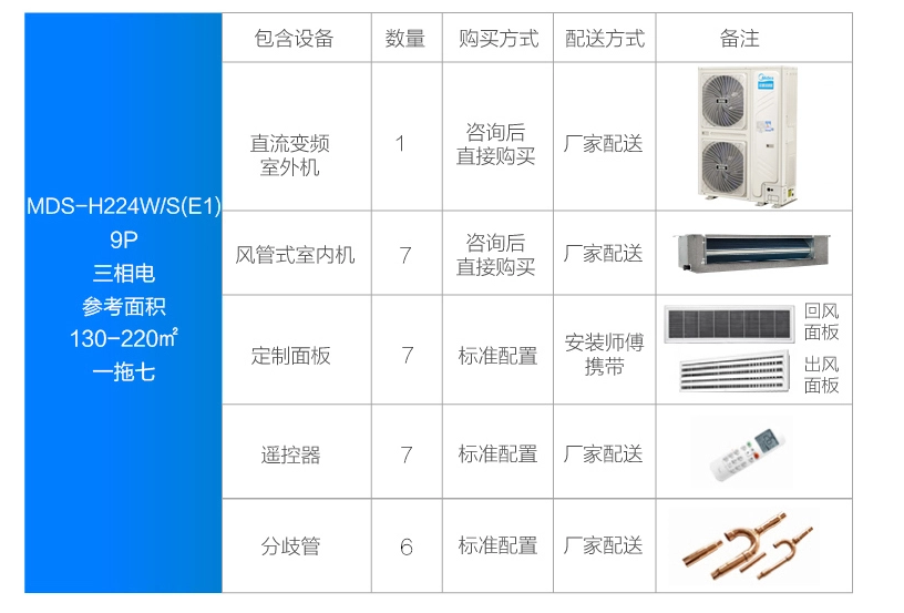 室外機安裝說明書*1、室外機使用說明書*1、室內機使用說明書*1、美的暖通設備用戶服務指南*1、美的家庭中央空調安裝竣工報告書*1、出水管接管*1、網絡匹配線組*2、一字螺絲刀*1、密封圈*1、底盤放水蓋*2 |