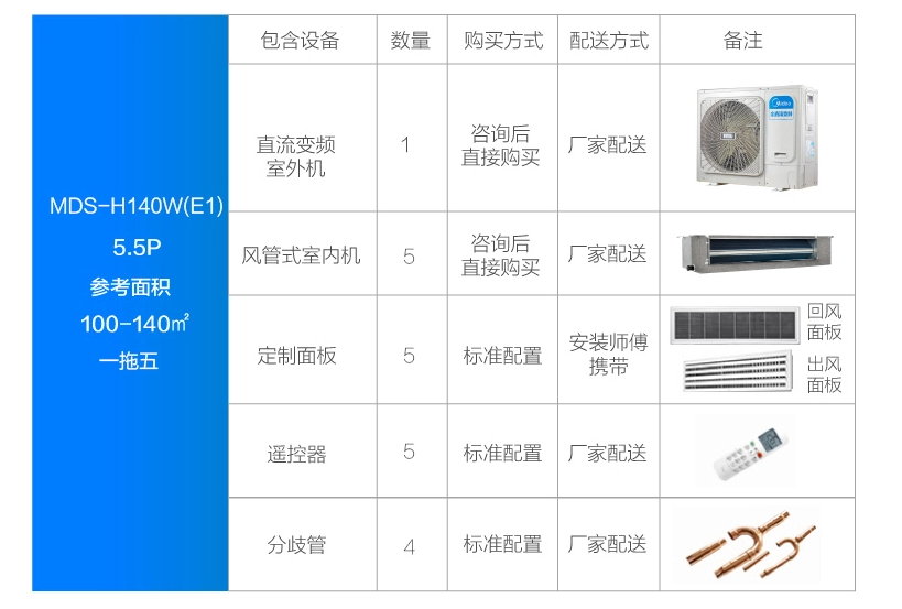 室外機安裝說明書*1、室外機使用說明書*1、室內機使用說明書*1、美的家庭中央空調安裝竣工報告書*1、出水管接管*1、網絡匹配線組*2、用戶服務指南*1、連接管(適用于16KW機型)、L型管(適用于10~14KW機型) |